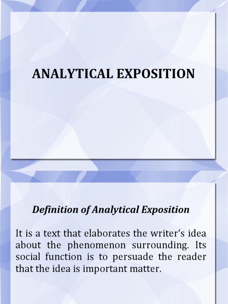 Analytical exposition is a text that elaborates the writers ideas about the phenomenon surrounding. Definition of analytical exposition exposition is a text that elaborates the writers idea about the phenomenon surrounding. Introducing the topic and indicating the writers position argument 1.