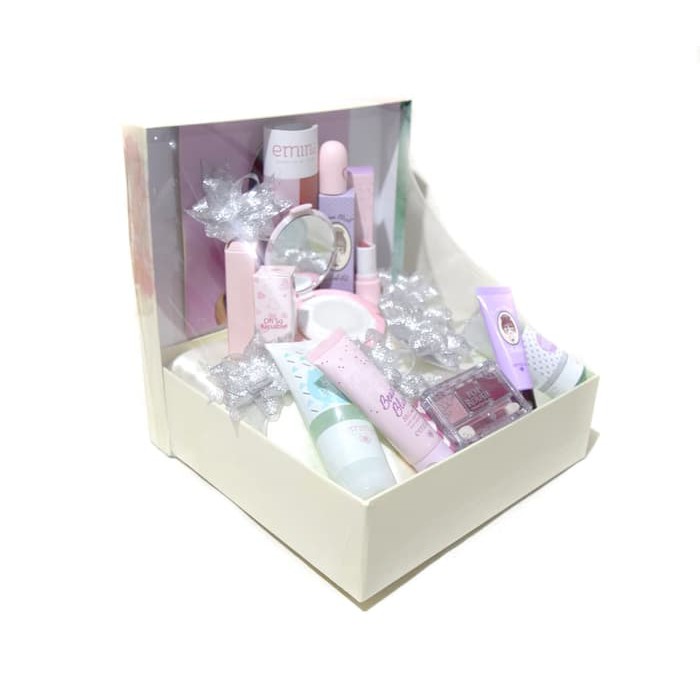 Paket parsel seserahan hantaran kosmetik emina ini cocok untuk dipilih. Tinggal pilih produk kecantikan yang diperkenalkan oleh brand asli indonesia ini. Memiliki deretan warna cerah sehingga menarik para pembelinya.